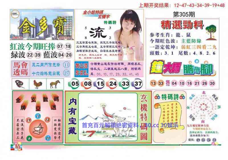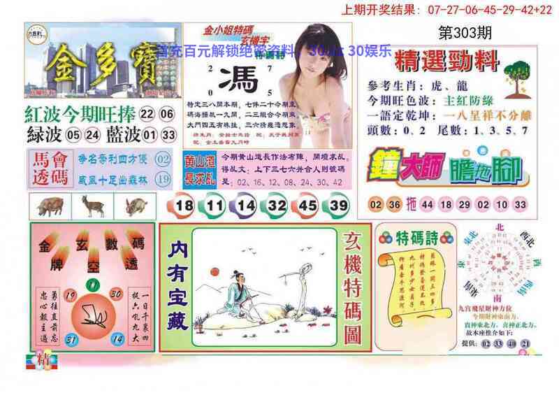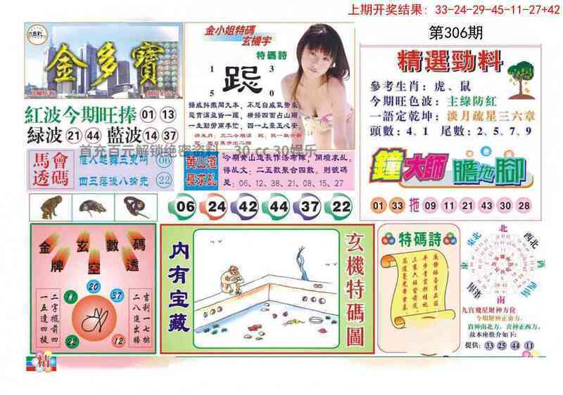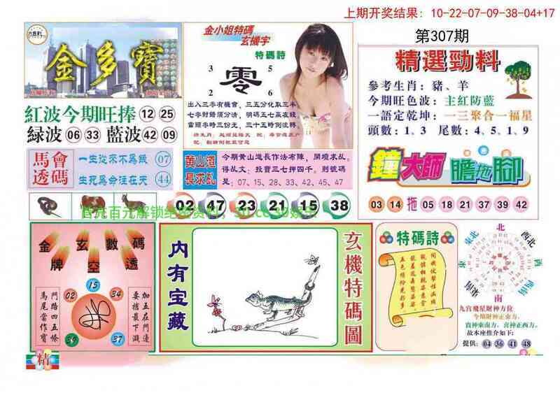 | 307期:金多宝 解:图中一语定乾坤可解大器晚成的生肖,牛蛇马鸡猴狗 综合:牛蛇马鸡猴狗 防特:09.45.10.34.08.20  |